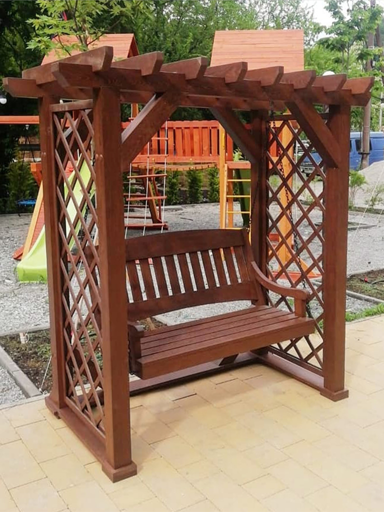 Размер: длина лавки 1300мм с подлокотниками,  длина по стенкам перголы 1700мм, ширина по стенкам перголы 900мм, высота перголы  2000мм.